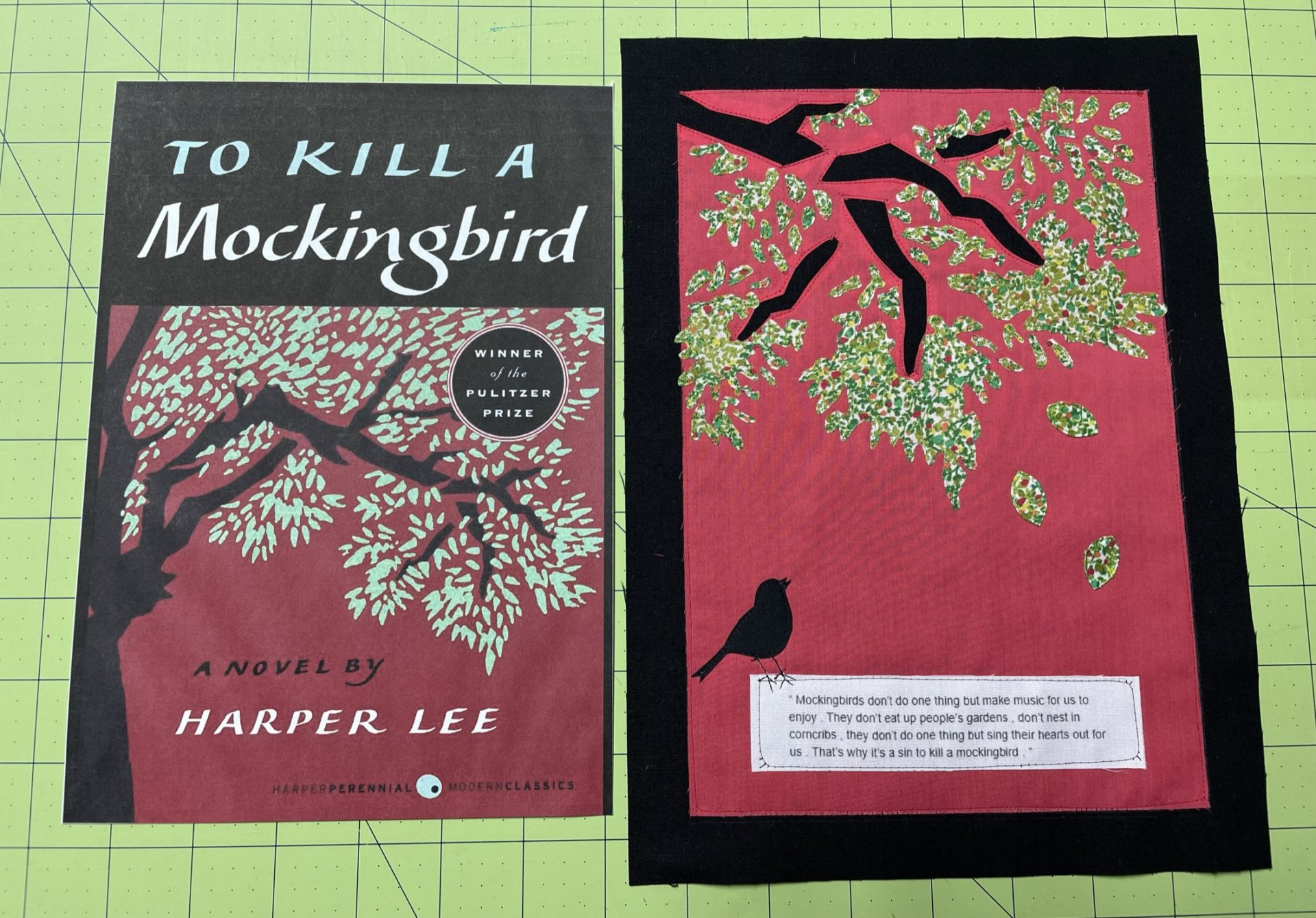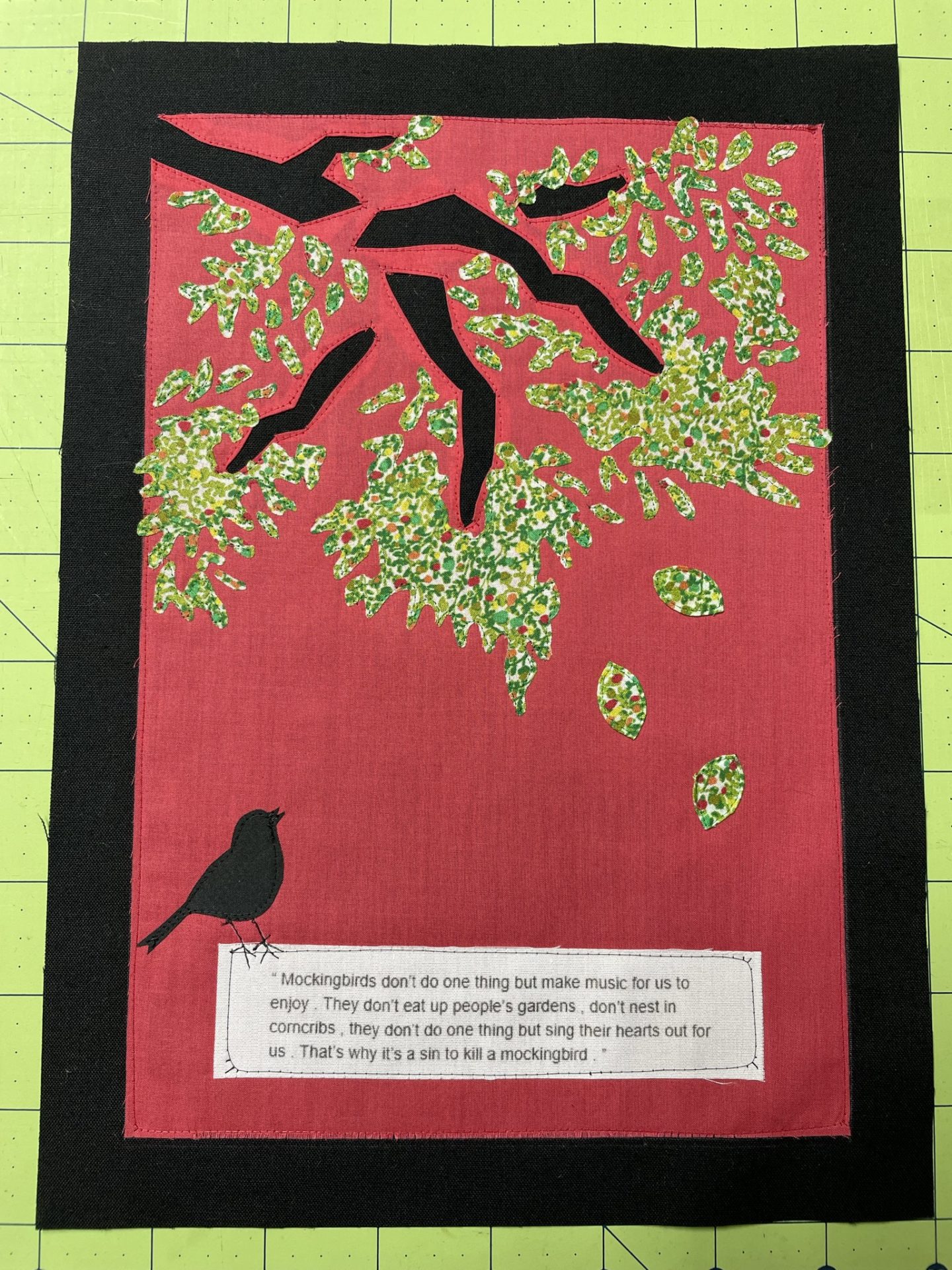 I cropped the cover illustration down to one element and used cotton lawn on a backing of black Kona cotton for my rendition of this cover. The limbs are turned edge reverse applique, the tree canopy and the bird are machine stitched raw edge applique, and the 3 falling leaves, which are symbolic of the 3 children falling out of the innocence of their childhood, are turned edge applique, also machine stitched. The book’s title is represented by the passage in the book that the title is taken from, cut & pasted from my kindle and then printed on cotton poplin.