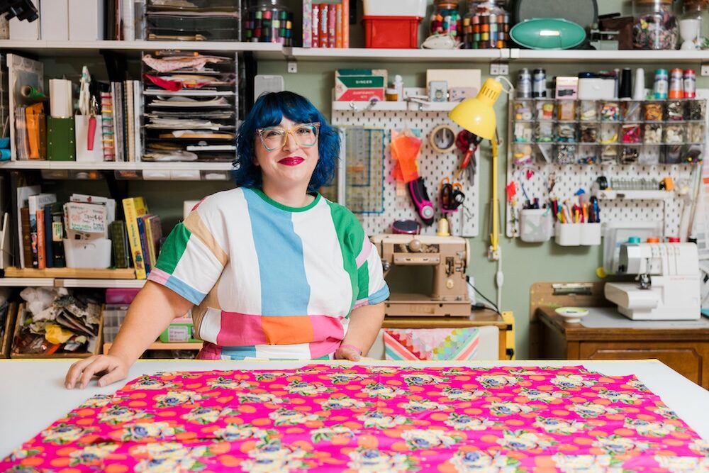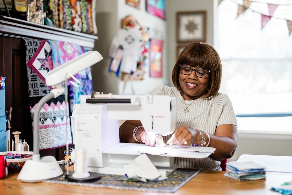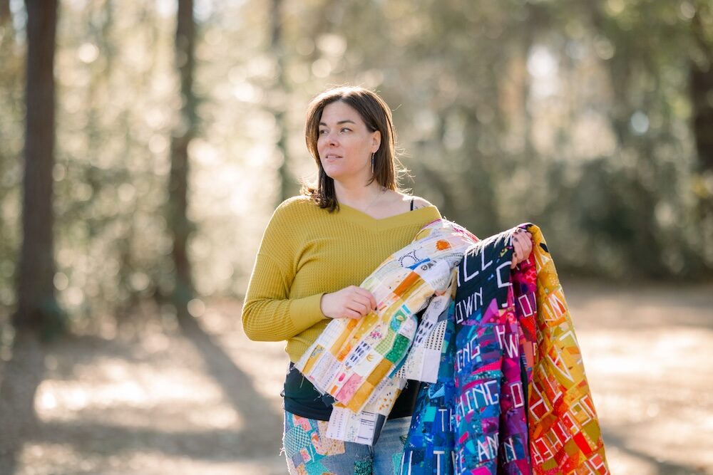 Sarah Ruth Morris is a fourth-generation quilter from Appalachia whose work spans fundraising quilts for vulnerable children and narrative pieces that confront trauma. From her Houston sewing space, the artist behind Ruthlessly Handmade creates quilts designed to make people feel, including her collaborative quilt Unforgotten about sexual assault.