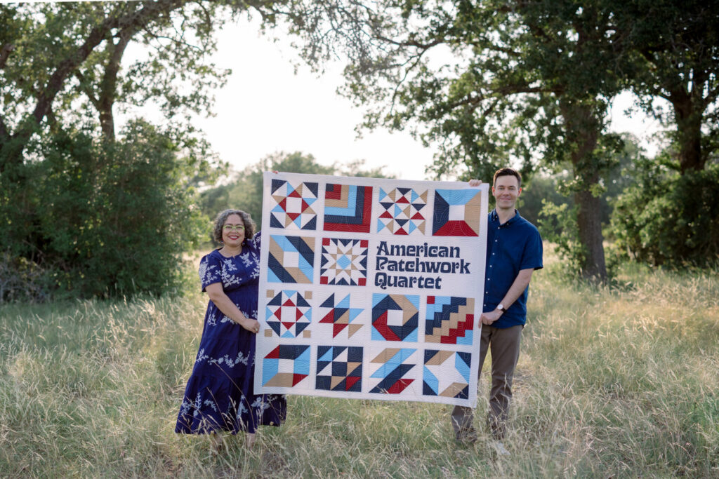 When it came time to plan the cover design for American Patchwork Quartet’s first album, Clay Ross, the band’s founder and guitarist, knew he wanted a quilt image in which each block would be different and represent one of the 14 songs. He reached out to Ty Wilkins to design the cover, and then, Ty reached out Houston quilter Marisa Wilhelmi to turn his design into an actual quilt.