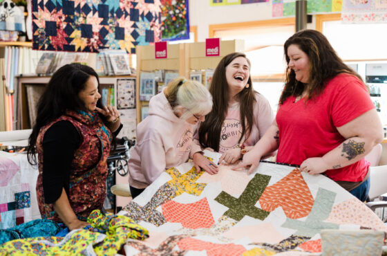 Fourteen shops across the state are participated in this year’s hop. Each shop had its own block (each designed by Marie), and the 14 blocks stitched together form The Last Frontier quilt, a marvelous tableau of Alaska wildlife. Among the block designs, were arctic foxes and polar bears, ground squirrels, hares, caribou and bald eagles, not to mention grizzly bears, puffins, musk ox, and orcas.