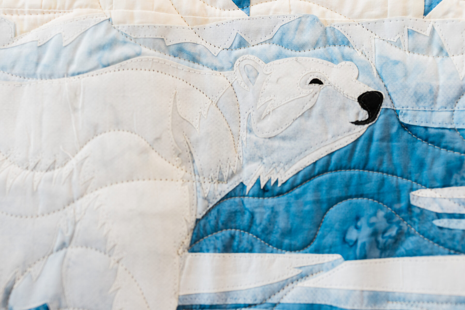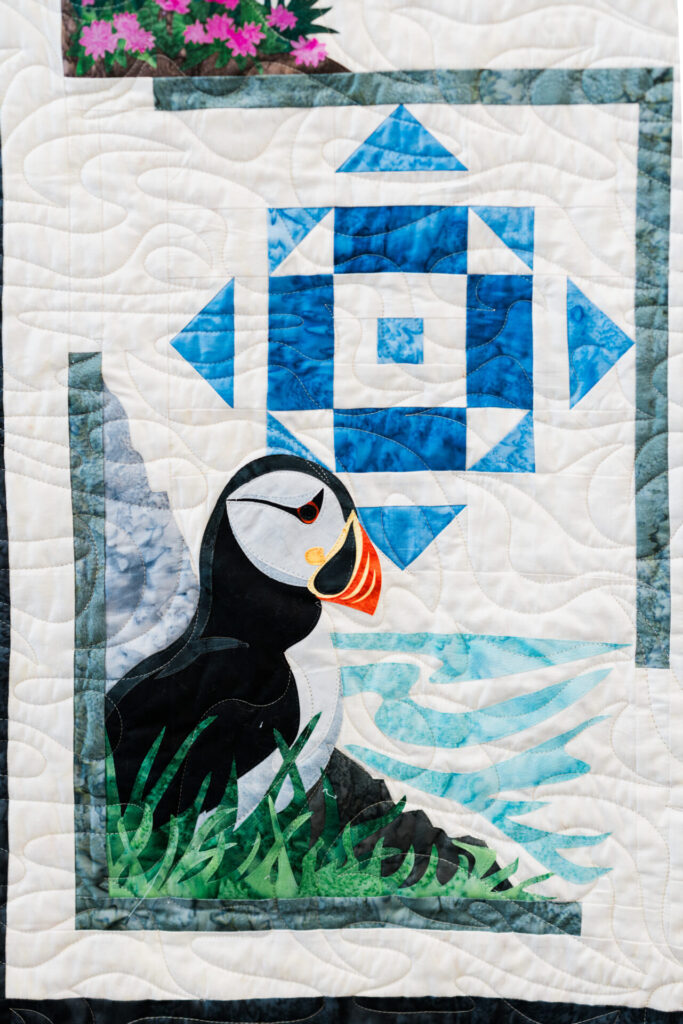 Fourteen shops across the state participated in this year’s hop. Each shop had its own block (each designed by Marie), and the 14 blocks stitched together form The Last Frontier quilt, a marvelous tableau of Alaska wildlife. Among the block designs were arctic foxes and polar bears, ground squirrels, hares, caribou and bald eagles, not to mention grizzly bears, puffins, musk ox, and orcas.