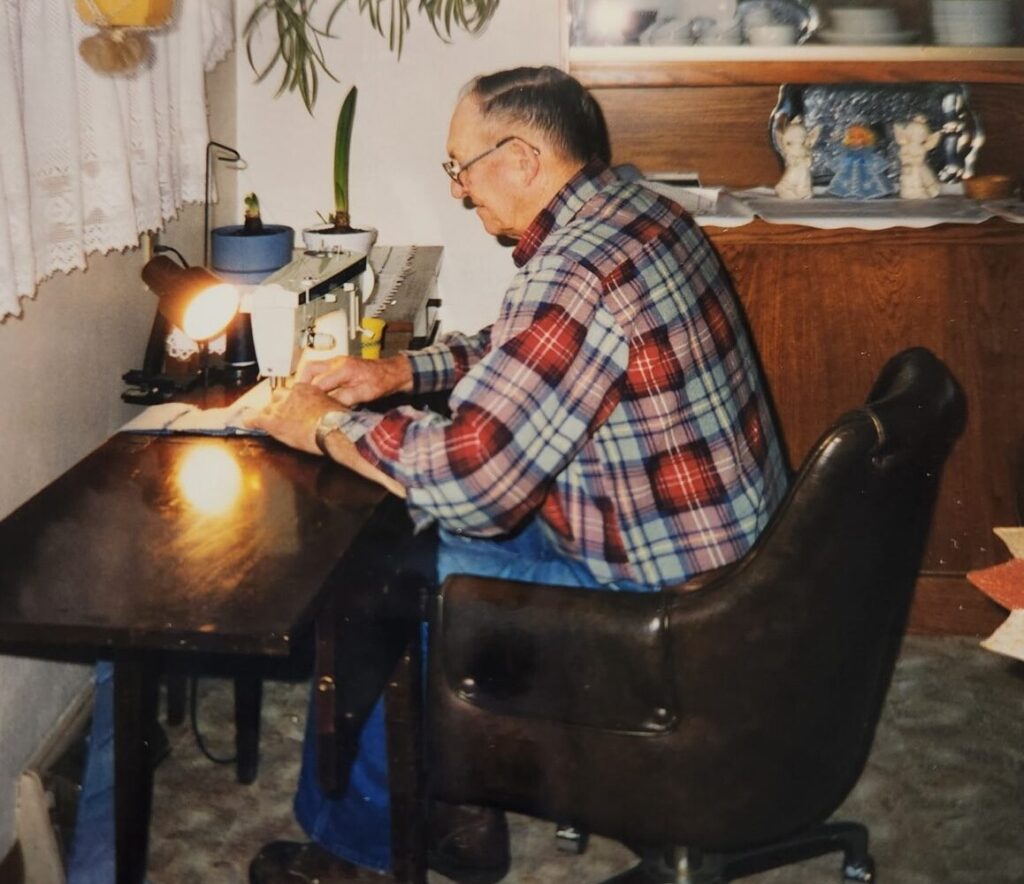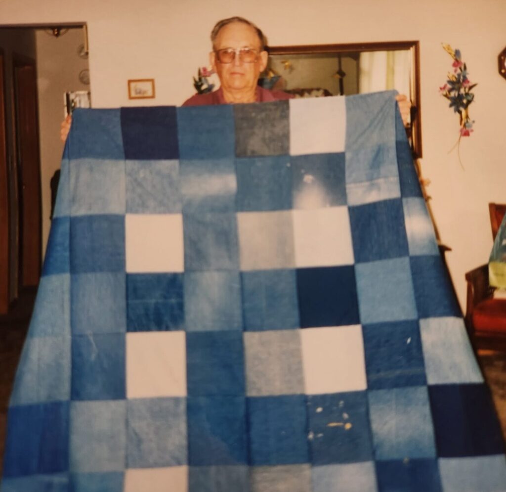“After his retirement from farming in 1984, he and my grandma moved into town: Pocahontas, Iowa. My grandma continued to embroider quilt blocks and make quilts. With not a lot to do with himself besides garden, my grandpa decided to start collecting blue jeans from everybody he could, so he could help the church ladies make quilts for overseas missions,” Staci said.